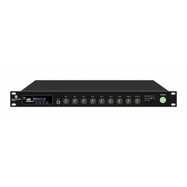 Мікшуючий підсилювач для монтажу в стійку 19"; 1 зона; вихідна потужність 60 Вт; вихід на гучномовець 100 В та 4-16 Ом; вбудований MP3-медіаплеєр з USB/SD, FM-тюнер, Bluetooth та ІЧ-пультом; інтерфейси: 4 мікрофонні входи 6.3 мм jack, 2 лінійних входи RCA, вхід EMC для екстрених повідомлень; система пріоритетів: MUTE > MIC1 > EMC > інші джерела; налаштування гучності, низьких/високих частот; світлодіодні індикатори; живлення AC 110-230 В / DC 24 В; розміри 484 / 370 / 45 мм; вага 4.5 кг